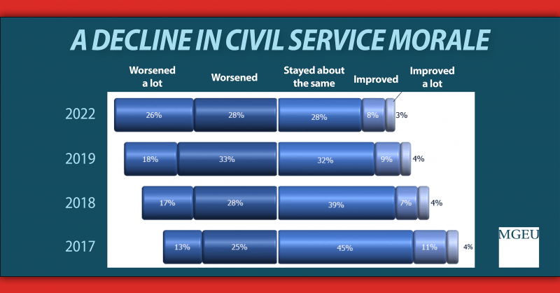 - Declining employee morale since 2017, with 54 percent of Civil Servants reporting morale has worsened or worsened a lot over the past two years;